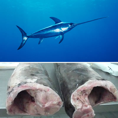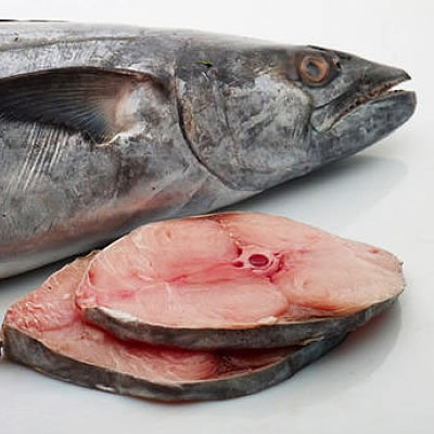 Swordfish is a large elongated round seawater (marine) fish. Classed as a white fish, the flesh is very meaty. They can reach a size of 14ft and 1,400 lb (that’s 650kg). Swordfish are mainly caught by the long-line fishing method and can be found in all tropical to temperate oceans and Indian Ocean is also popular for quality sword fish.