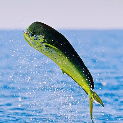 Mahi-mahi have compressed bodies and a single long-based dorsal fin extending from the head almost to the tail. Their caudal fins and anal fins are sharply concave. They are distinguished by dazzling colours - golden on the sides, and bright blues and greens on the sides and back.