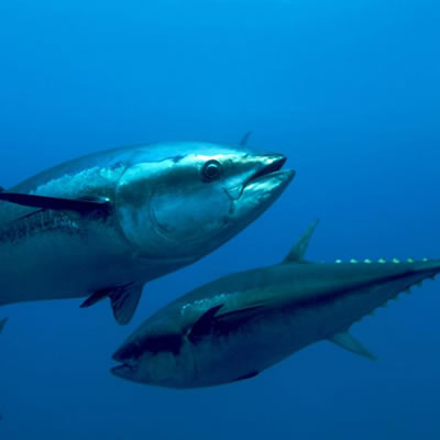 Yellowfin tuna (Thunnus albacares) are torpedo-shaped with dark metallic blue backs, yellow sides, and a silver belly. They have very long anal and dorsal fins and finlets that are bright yellow. Yellowfin can live up to six or seven years. They are highly migratory and are found throughout the Pacific, Atlantic and Indian Oceans.